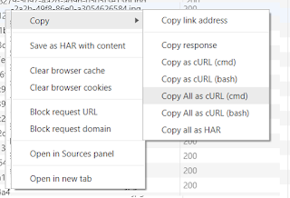 4. Right-click (or two-finger click on a Mac) on one of the network traces and select Copy->Copy All as cURL (use cmd for Windows and bash for Mac).